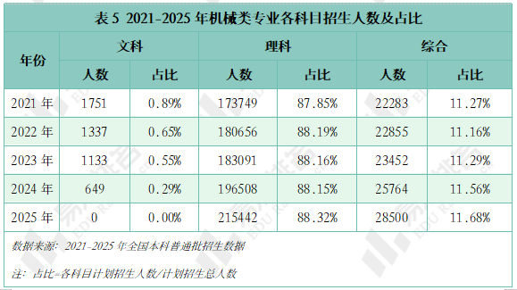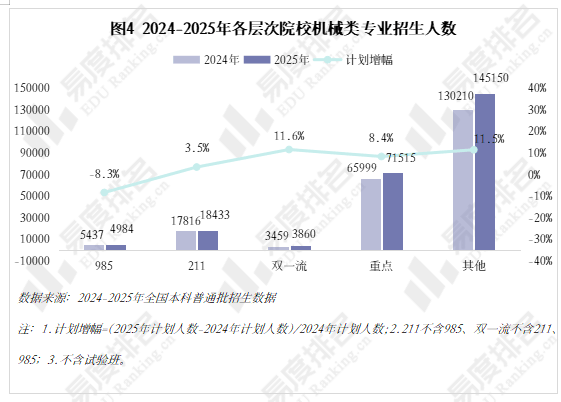 取专业点新增数量一样,机械类专业招生院校数量也履历了先削减后添加的过程,且拐点先于专业点呈现,于2022年降至687所后逐年添加,2025年共有706所院校招收该专业类。但其增速不及全国本科招生院校总数增加速度,院校占比尚未回到2021年程度。 985院校机械类招生人数波动式下降,本年达到五年来最低,较2024年缩减8。3%,其他各条理院校则有3%-12%的涨幅,以更大的体量支持机械类招生总规模的抬升。 机械类专业招生打算人数逐年添加,打算占比连结正在5%以上,同专业类年增数量一样,正在2023年触底反弹。乘着机械人、新能源财产的春风,机械类专业正正在进行跨专业转型,已经的“工科之母”正在多年冷掉队热度回升。