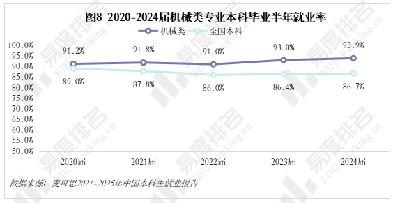 机械类专业结业五年就业对劲度差强人意,2020-2021年较平均值低5%摆布,2022年起头逃逐,但一直处于正在平均线及以下。