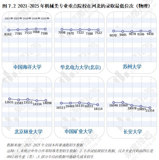 近年,2021-2023年“三连降”,2024年急速回升,本年又起头下滑,华中科技大学、大连理工大学较客岁降幅达28%、23%。虽说机械类专业有所回温,但并非大热专业,尚处于新老专业更替期间,保守专业仍是招生从力,这就导致部门院校正在招生策略调整时将更多比例投放至市场需求度更高的专业,以“机械五虎”之一华中科技大学为例,2025年机械类招生打算较上一年降幅高居各专业类第一,电子消息类专业则扩招最多。 985、211等高条理院校近五年登科位次走势并未呈现较着集体倾向,各校波动非常值较少,全体不变。以省为例,选择招生打算波动较小的六所高校进行展现,当然,各校环境有所分歧,中国海洋大学小幅上涨,华北电力大学()、姑苏大学极其平稳,中国矿业大学和长安大学正在缩招的环境下位次仍然呈现下滑。 机械类专业被誉为“工科之母”,正在上世纪鼎力奉行机械化时红极一时,后期陷入长达几十年的缄默期。风水轮番转,跟着新能源汽车、机械人财产成为新的风口,机械类专业的春天似乎回来了?